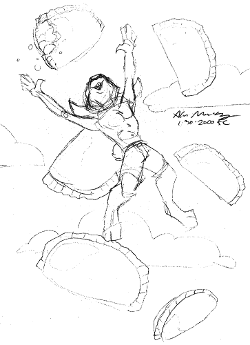 | Thumper experiences Fruit Pie Heaven! The last day of FC2000, Thumper and Rosco were hanging around my table. Thumper had reportedly been eating quite a number of Hostess Fruit Pies that day, and it became something of the dominant theme of conversation. So, while on a Hostess Fruit Pie sugar high myself, I drew this lovely sketch in Rosco's pad of Thumper floating around in Hostess Fruit Pie Heaven. |