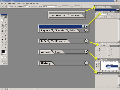 Before we begin, let's take a moment to examine the new interface on Photoshop 7.0. Below is a screenshot of how I have mine set up. The tiny windows on the right are very important. I like to always have lots of room for the Layers window, and always have the History window visible for correcting mistakes. You can rearrange these windows by dragging their tabs around. As you use Photoshop, you'll discover what tabs are most important to the way you use it, and you can place your tabs accordingly.