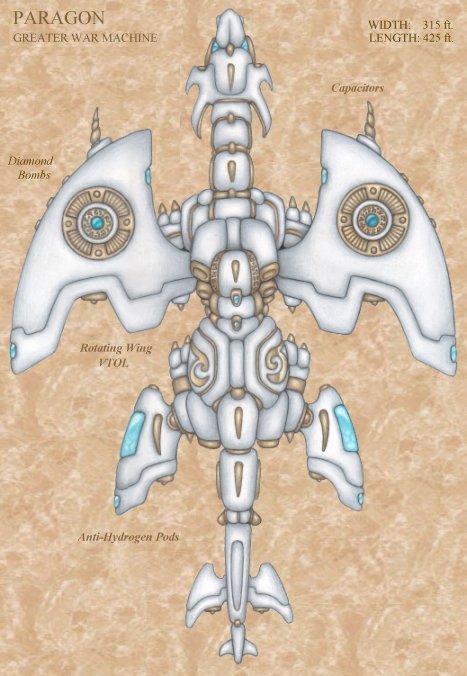 Ground Beam: The ancient war machine employs this close-surface weapon to eliminate more specific targets, such as creatures or vehicles. The brilliant blue-white beams fire downwards from the reactor hub's focal lens, causing tremendous concentrated damage. Paragon can fire one of these beams per round, or spend a full round action to charge for a simultaneous cascade. Treat these rays as Disintigrate spells, with a reflex save DC 20 to avoid the full effect. A successful save is still a near miss, inflicting 5d6 points of divine damage. They can be fired from a maximum height of 100 feet, or on the ground with wings inverted.