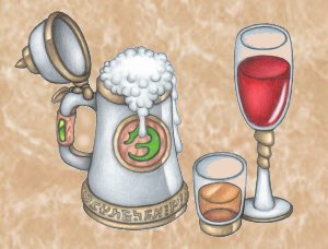 It seems that just about every culture the world over has been introduced to some measure of the fermentation process. From the classic human products of distillation and vinting, to the unimaginable swill sucked down by the czath, everyone seems to enjoy a good drink. Even the Spiral Order renders down organic life energy into a vile black ooze that their ageless bodies use to maintain flexibility. There are far too many varieties to fully explain, though the following list details some of the more popular and/or common brews found throughout the civilized lands, and a few of the really exotic oddities from the jagged edge of nowhere. In general, alcohol tends to bolster courage, impair judgement, and loosen the tongue. Its effects are slightly different on the various species, however. Elves often become wild and fae, whereas skoles only seem to loosen up a little. Hoomiku completely lose their phenomenal intelligence, koba become more resistant to cold, and lutrai try to eat everything in sight. The listed prices may go up or down slightly, depending on location or occasionally prejudice.