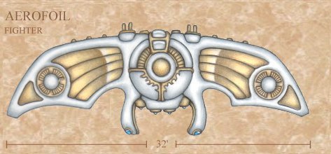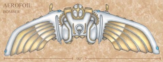 The aerofoil is a wonder of ancient times, a vessel capable of flight. Like the larger bomber, the low-flying fighter class was engineered by the City Mind to combat its airborn foes. These included dragons, griffins, and all manner of angelic and demonic beasts send by the gods throughout the course of the Twilight War. In air-to-air combat, this flying machine outperformed them all. With their high-speed vertical take-off fans and light, agile airframes, the various fighter types could be deployed rapidly in combat, and reach nearly any target area in minutes. Armed with a variety of air-to-air weapons, these craft were also responsible for defending larger aerofoils such as bombers and transports. Their powerful hydrogen engines could push them up to speeds in excess of mach one, though a typical engagement velocity was closer to three hundred miles per hour. Alternatively, the aerofoil could engage slow-moving ground targets by hovering on its fans.