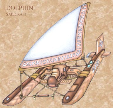 The lutraic dolphin is a remarkable unification of magics in boat design, a ship which sails circles around even the fastest vessels built by non-aquatic races. The dolphin makes use of mastless sail woven with elemental wind wards, glyphs which make it more like a flying carpet than anything else. The pontoons and single-seat hull are all composed of a light, highly-durable wood, which is coated in a hard, waxy resin to reduce water resistance and protect against decay. Joining the sail and hull is a complex rigging which allows the agile craft to be steered by both leaning and pulling the sail's orientation left or right by means of side-mounted handles. The ship is so light that it actually leaps off of waves and can sail for hundreds of feet before splashing down again. Skilled boaters can reach speeds of nearly sixty miles an hour riding a storm front, though the craft's general cruising speed is about half that. These boats are generally used as racing and pleasure craft, and are very popular among the lutrai youth.