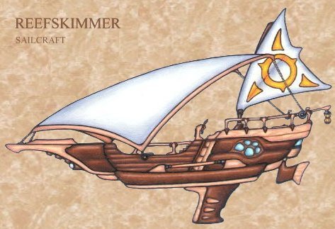 The reefskimmer is named for its shallow bottom, ideal for cruising the reef-strewn shallows around Cekus. The boat can carry up to six comfortably, with a small cargo area for food and supplies. Belowdecks, there is typically a single cozy (10x8x5) room towards the back of the ship, lined with pillows and other comforts. These rooms most often have scenic windows of shaped crystal or glass liberated from the many shipwrecks that line the Coral Maze.