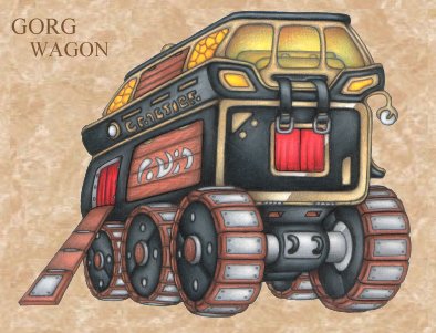 When they can actually be persuaded to move, the hedonistic gorgs insist on traveling in style. Their enormous wagons are designed for both the ultimate in comfort and security, a garrish cross between a tank and a luxury inn suite. The rolling fortresses average six-hundred square feet, heavily protected and capable of crushing an armored phalanx without so much as slowing down. The interior is a sharp contrast, the very lap of decadence, all geared towards the owner's comfort throughout the entirety of even the shortest voyage. Some merchants will even take a portion of their business with them on the road, stocking their wagons with exotic goods, slaves, and food of all kinds. The wagons are often fully-enclosed and able to resist even the fiercest weather. Light, heat, and cooling are all provided by Arcanar appliances.