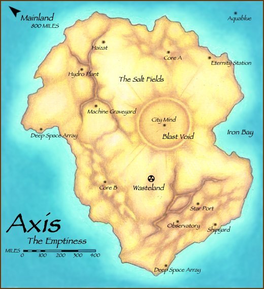 Axis was once the heart of the Creator Empire, a lush, verdant sub-continent of sculpted landscapes and towering spires, of domed cities and glittering webworks of hypersonic track. Once this was a paradise, a warm and fertile land dotted with glittering glass cities. This was the golden age of Rym, the Age of Reason, a time of wonderous insight and learning. Through their new sciences, the Creators sought to understand the purpose of their own existance, and to change the world itself rather than accept its hardships. They broke away from the guidance of their ageless parents, intent on controlling their own destiny, and in doing so drove a rift between the followers of logic and faith. In the end, after centuries of mounting hostility, the Creators resolved to build their own god, to fight a war on their behalf. They called it the Perfect Mind, a Pandora's Box of terrible knowledge. It was to be the end of their civilization.