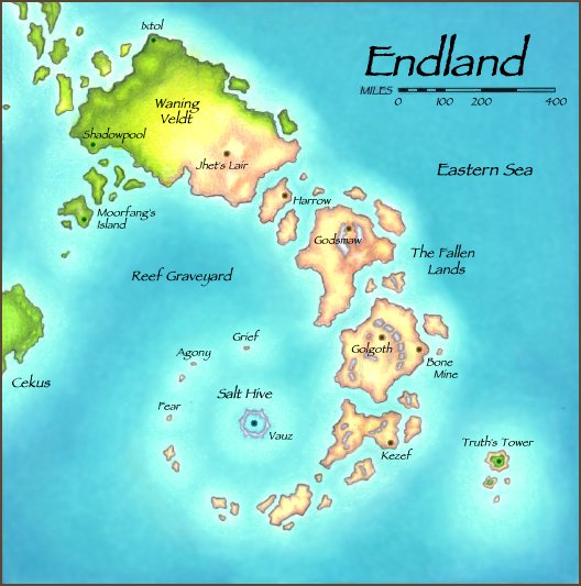 When Halus died, his body fell into the sea and formed what is now called 'Endland', destroying most of the hyperspan causeways that bridged the southern islands in the process. The entire region is littered with the leviathan's remains, and barely a scrap of life can be found amid the crumbling fragments. Dunes of sterile bone dust form powdery white deserts amid the great, mountainous vertibrae that dictate the basic layout of the islands. The unnatural circular formation is actually Halus' tail. To the north, across the skeletal reefs and whalebone graveyards, the borders of Midland slowly buckle under the Spiral's steady encroachment. Even those few slavers brave enough to sell their captives to the Spiral rarely venture past these faltering borderlands, trading their wares in the slum town of Harrow.