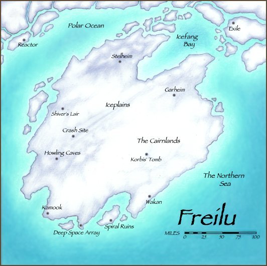 This frigid terrain is perpetually covered in ice and snow. Icepacks are either regions of frozen ocean or the top of large glaciers. There is no native vegetation and very little native life. Snow and unchallenged winds slow movement and a lack of natural landmarks make it easy to get lost. Tundra is simply frozen plains, frequented by hardy heard animals and even hardier lichens and vegetation. Some skole tribes make their homes in this terrain.