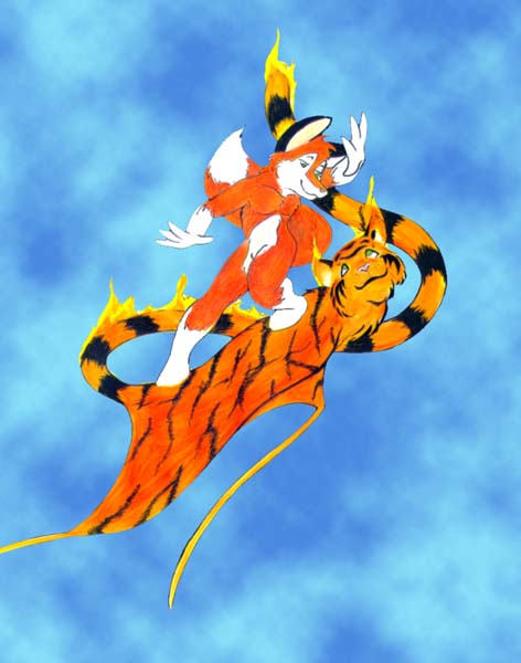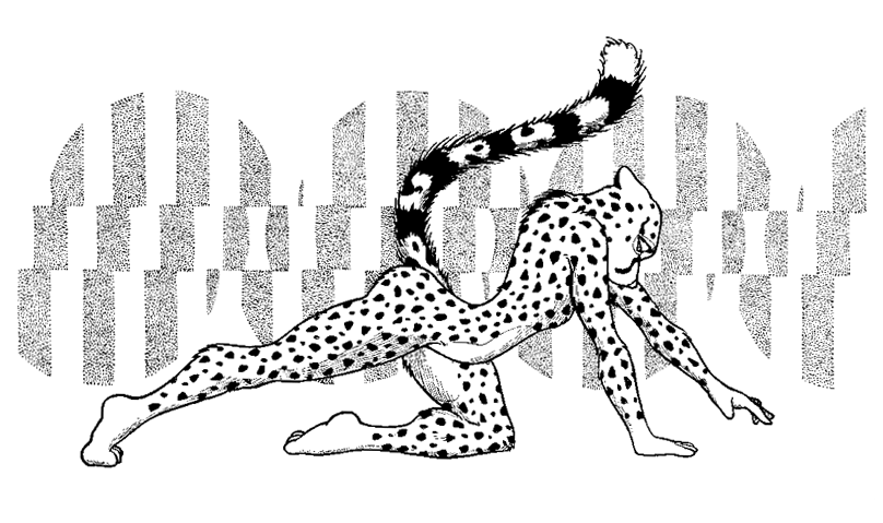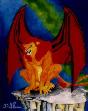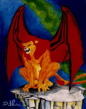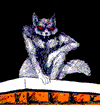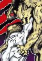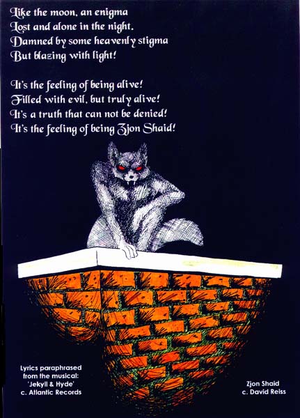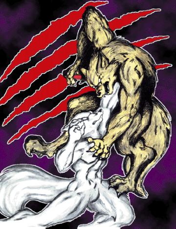 A ghostly wolf crouches atop a building, looking down at his prey.